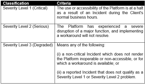 (a) Incident Classification. When an Incident occurs concerning the Platform and is reported to INSIGHT by the Client or discovered by INSIGHT, INSIGHT will assign a severity level to each Incident based on the Incident Classification Table below.