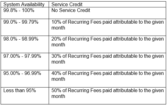 (c) Service Credit. If INSIGHT fails to meet a System Availability of 99.5% during any month of the Term, the Client may request Service Credits as specified in the table below.